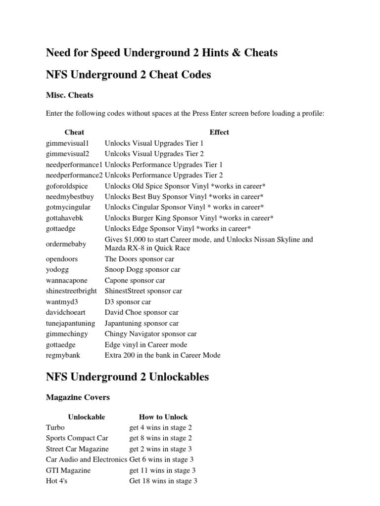 Underground cheats, cheat codes, hints, trophies, achievements, faqs, trainers and savegames for pc. Need for speed undercover has players racing through speedways, dodging cops and chasing rivals as they go deep under. Need for speed underground 2. All the latest need for speed: Use the above links or scroll down. Underground 2 can be used to unlock sponsor vehicles, gain early access to performance parts, earn extra bank, or unlock unique vinyls. If you didn't find needed cheats put request or ask question about this at special section of the game. Underground cheats, codes, unlockables, hints, easter eggs, glitches, tips, tricks, hacks, downloads, achievements, guides, faqs, walkthroughs, and more for pc (pc). Home pc need for speed underground cheats. Underground cheats list for pc version. Remember to come back to check for more great content for need for speed underground. Underground cheats, cheat codes & hints cheat codes start game as usual. Unlock the toyota celica in split screen/quick race mode and successfully complete the first tournament in underground mode.